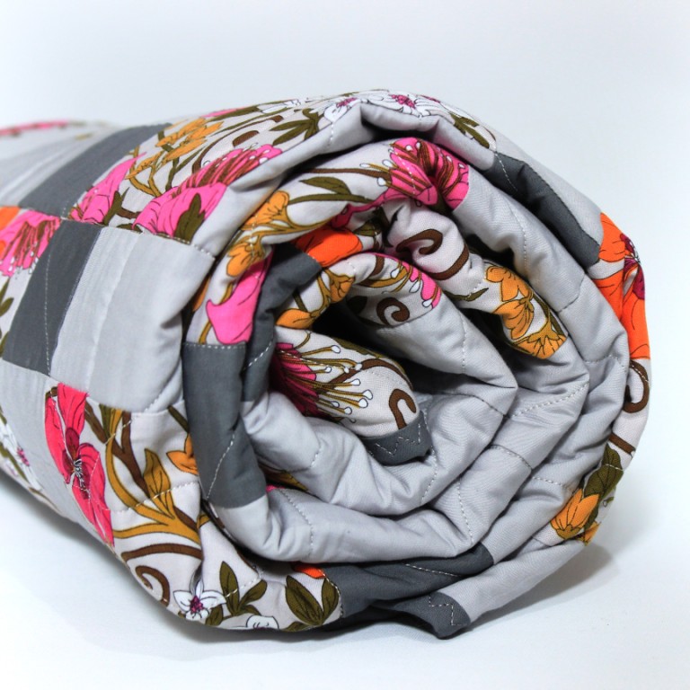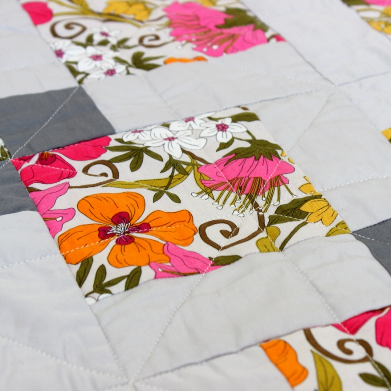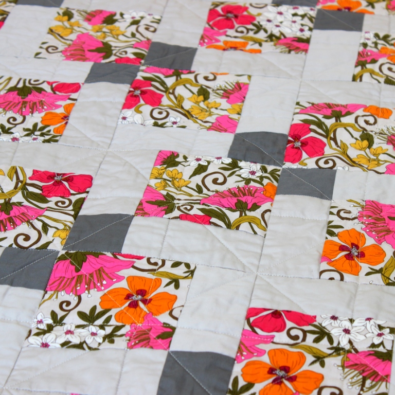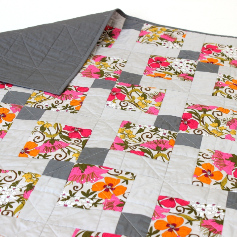 This quilt uses the ‘disappearing nine patch’ block with an ultra modern twist by combining two plain fabrics and a bright pink floral. As a modern quilter, I almost never use traditional building blocks but the bold, neon florals and flat greys contrast each other perfectly and complement the geometric nature of the disappearing nine block design.